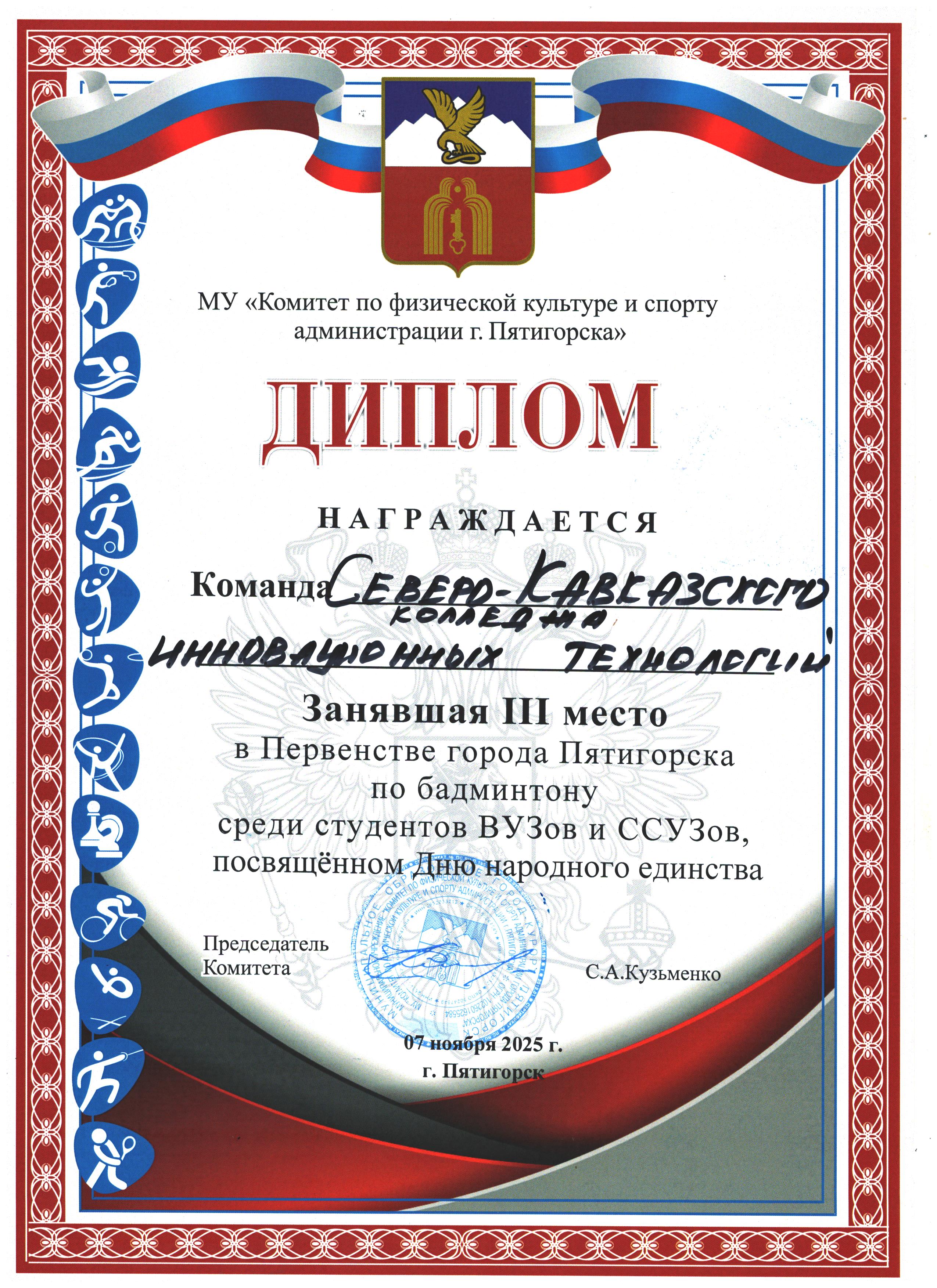 Комитет по ФК и спорту 1 место бадминтон-2024 Диплом