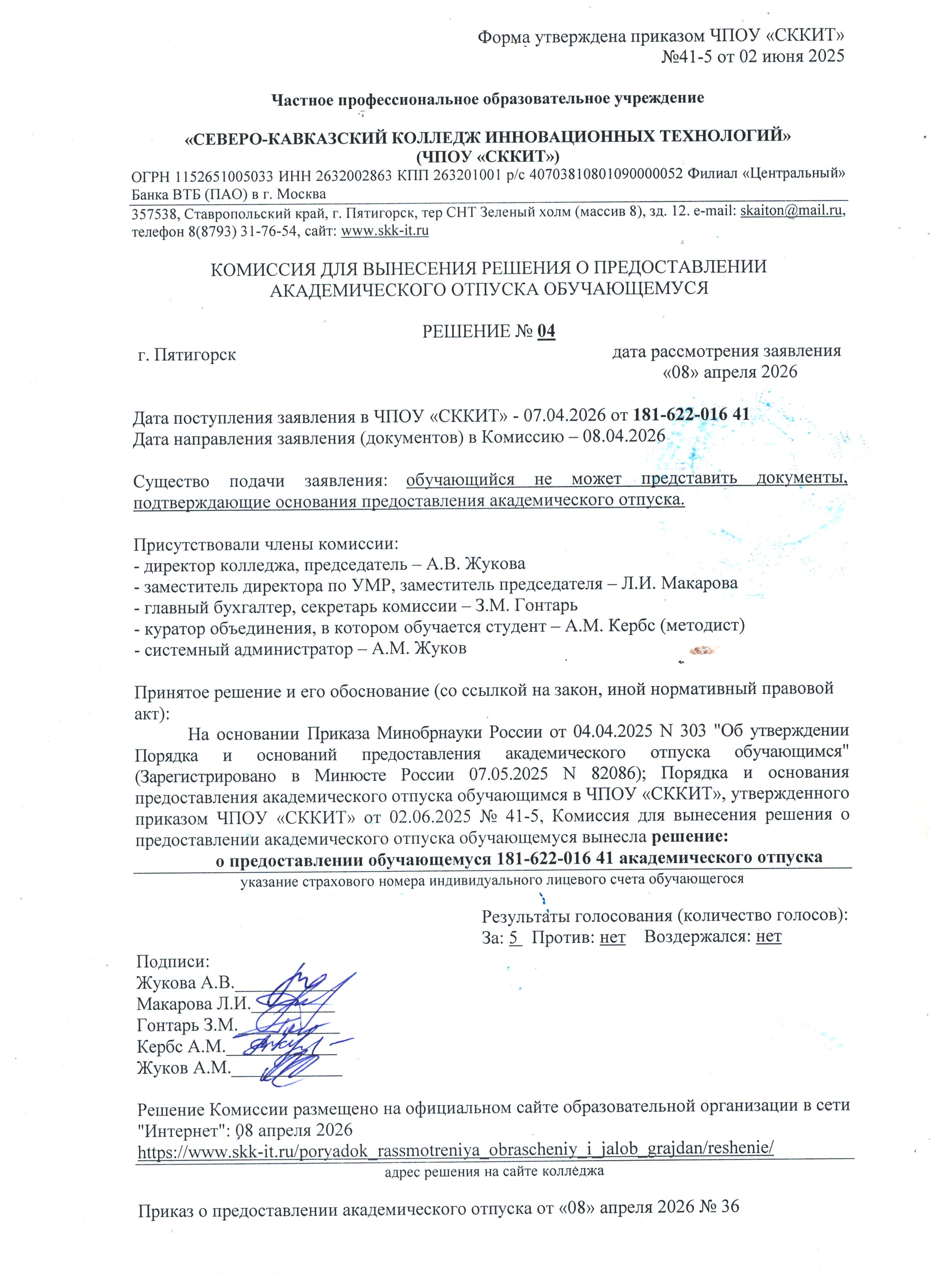Решение № 04 от 08 апреля 2026: обучающийся 181-622-016 41 (информация о предоставлении академического отпуска: приказ от 08.04.2026 № 36)