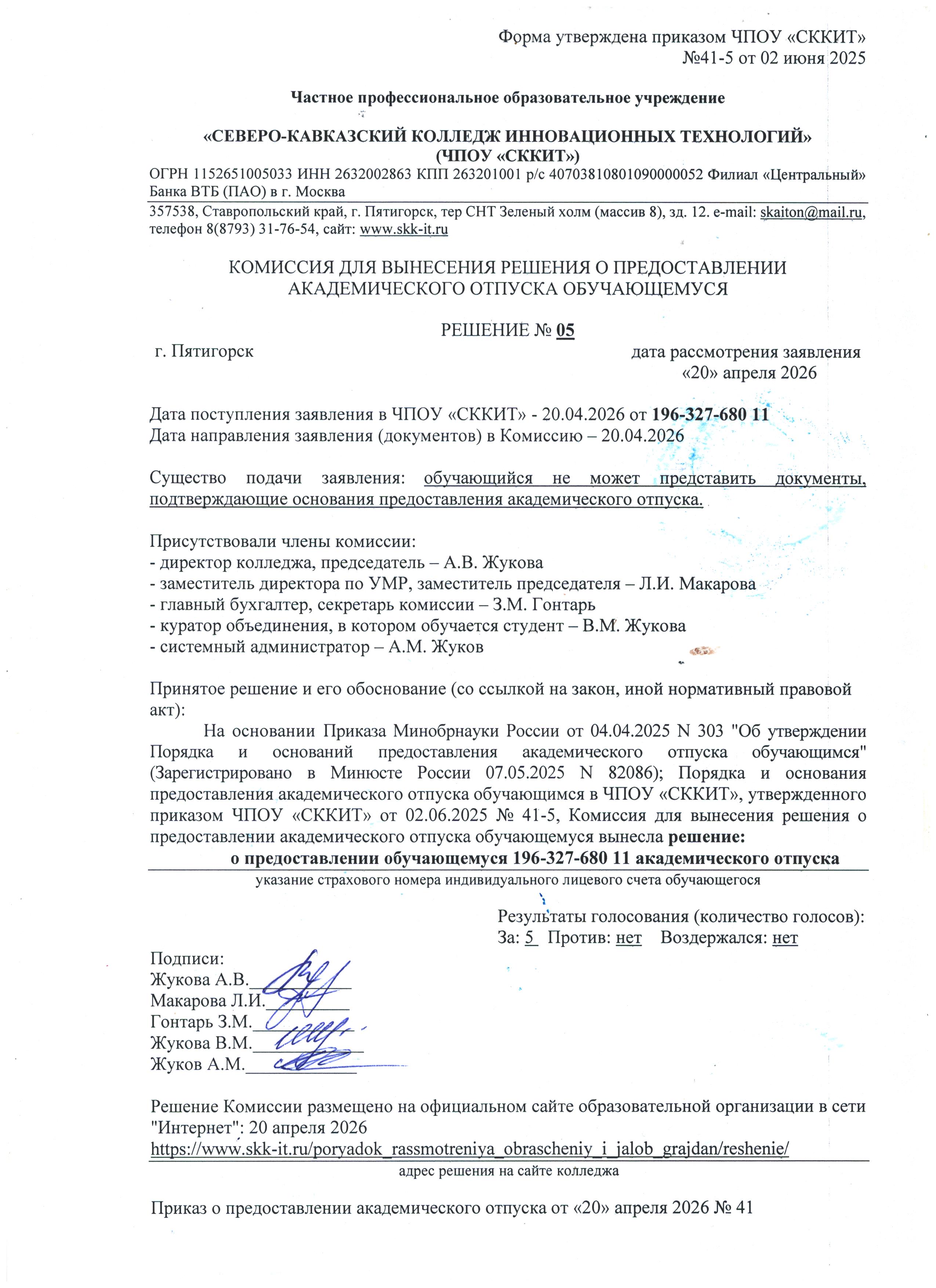 Решение № 04 от 20 апреля 2026: обучающийся 196-327-680 11 (информация о предоставлении академического отпуска: приказ от 20.04.2026 № 41)