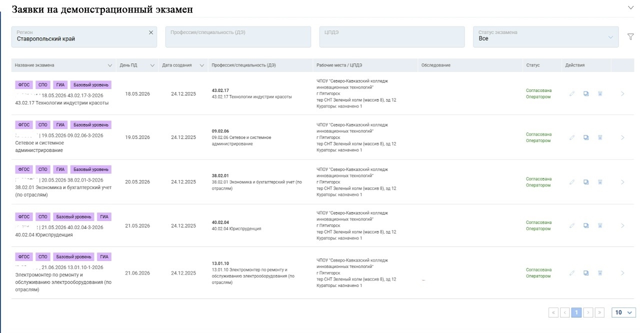 Все заявки от «Северо-Кавказского колледжа инновационных технологий» на проведение демонстрационного экзамена успешно согласованы Институтом развития профессионального образования (ИРПО). Это означает, что экзамены будут организованы в соответствии с установленными требованиями: утверждены сроки, составлены экзаменационные группы, назначены эксперты и определены центры проведения.